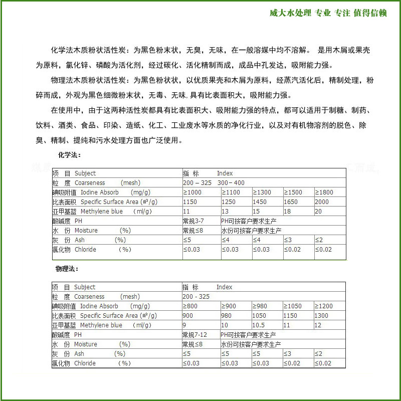踏踏實實,弘揚匠人精神!兢兢業業,塑造民族品牌!感謝您關注威大水處理官網木質粉狀活性炭產品信息,也歡迎您提出寶貴的意見,共同推進中國制造的國際競爭力!對威大木質粉狀活性炭若有疑問的地方,請撥打威大技術工程師電話: